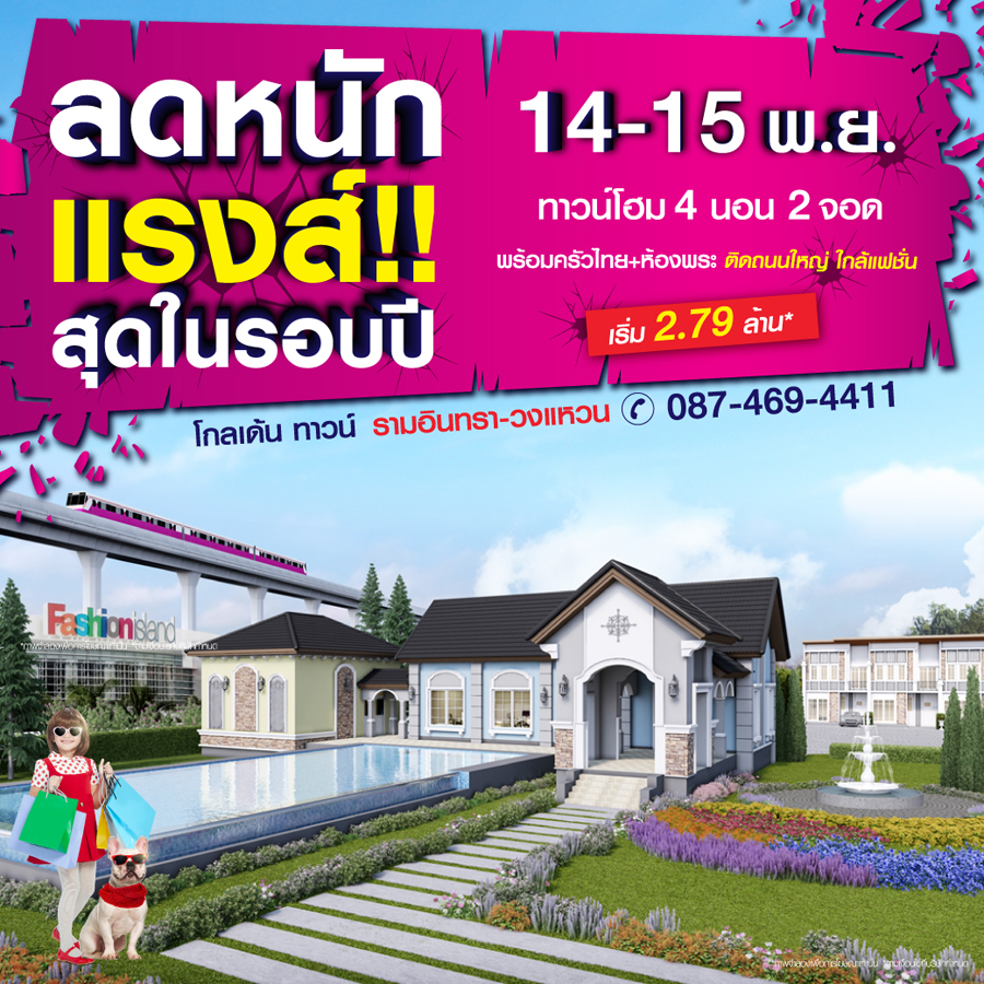 Promotion : 14-15 พ.ย. นี้ ลดหนัก แรงส์ สุดในรอบปี สุดปัง อลังการไม่มีแผ่ว ทาวน์โฮมหรู สไตล์อังกฤษ ขนาด 4 ห้องนอน 2 ที่จอดรถ พร้อมห้องพระ+ครัวไทย* อลังการสโมสร + โรงหนังส่วนตัว เดินทางสะดวก ติดถนนใหญ่ + ใกล้แฟชั่น เริ่ม 2.79 ล้าน*