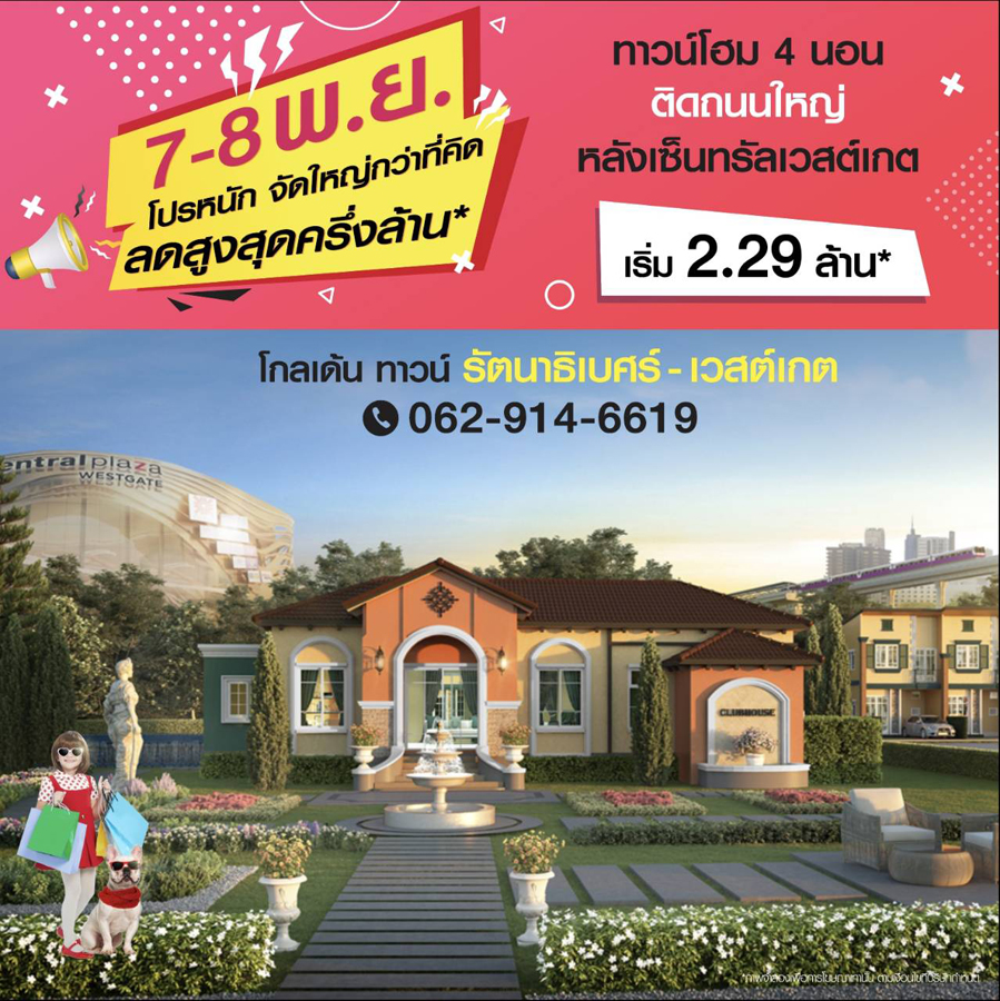 Promotion : 7-8 พ.ย. นี้ โปรหนัก จัดใหญ่กว่าที่คิด!! ลดให้สูงสุดกว่าครึ่งล้าน* คุ้มยิ่งกว่าคุ้ม ทาวน์โฮม 4 ห้องนอน พร้อมอยู่ คุ้มสุด!! กับฟังก์ชัน ครัวไทย + ห้องพระ พร้อมสโมสรส่วนตัว ท่ามกลางธรรมชาติร่มรื่น พิเศษบนทำเลทอง ติดถนนใหญ่ + หลังเซนทรัลเวสก์เกต เริ่ม 2.29 ล้าน*