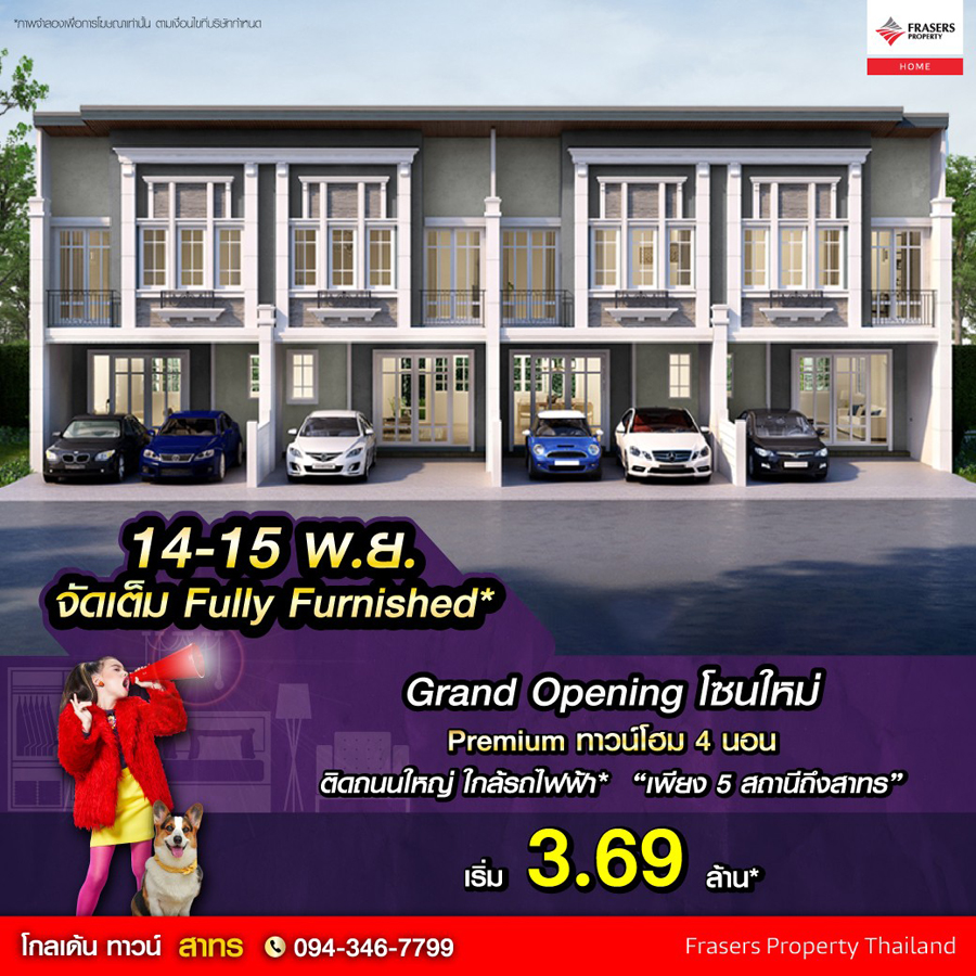 Promotion : 14-15 พ.ย. นี้ Grand Opening โซนใหม่จัดเต็ม Fully Furnished รีบเล้ย Premium ทาวน์โฮม 4 ห้องนอน 2 ที่จอดรถ ฟังก์ชั่นครบครัน ห้องพระ + ครัวไทย* พร้อมคลับเฮาส์หรู สไตล์อังกฤษ ติดถนนใหญ่ ใกล้รถไฟฟ้า " เพียง 5 สถานีถึงสาทร " เริ่ม 3.69 ล้าน*