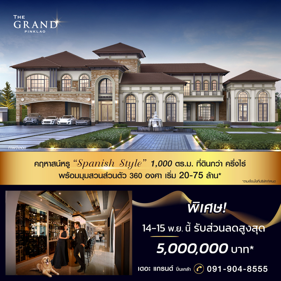 Promotion : คฤหาสน์หรู " Spanish Style " 1,000 ตร.ม. ที่ดินใหญ่กว่าครึ่งไร่ พร้อมมุมสวนส่วนตัว 360 องศา เริ่ม 20-75 ล้าน* พิเศษ 14-15 พ.ย. นี้ รับส่วนลดสูงสุดกว่า 5,000,000 บาท* ในอาณาจักรสแปนิช ที่สุดแห่งความภูมิฐาน คลับเฮ้าส์หรูดีไซน์เท่ โดดเด่นเป็นเอกลักษณ์ใหม่ สง่างาม บนทำเลศักยภาพ ย่านปิ่นเกล้า