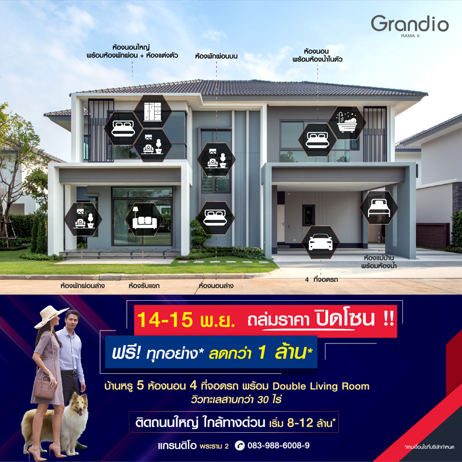 Promotion : 17-18 ต.ค. นี้ จัดโปรให้หนัก ห้ามพลาด กับบ้านพร้อมเฟอร์ ลดแรงกว่า 1 ล้าน* บ้านเดี่ยวสุดหรู 5 ห้องนอน 4 ที่จอดรถ พร้อม Double Living room ส่วนกลางสุดอลังการ วิวทะเลสาบกว่า 30 ไร่ คุ้มสุด! บนทำเลทอง ย่านพระราม 2 ติดถนนใหญ่ ใกล้ทางด่วน พิเศษเริ่ม 8 - 12 ล้าน