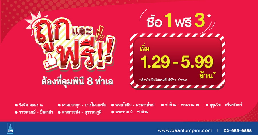 ถูกและฟรี ต้องที่ลุมพินี 8 ทำเล ซื้อ 1 ฟรี 3* เริ่ม 1.29 - 5.99 ล้านบาท