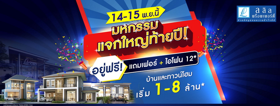 "มหกรรมแจกใหญ่ท้ายปี" 14 - 15 พฤศจิกายน 2563 นี้ ทาวน์โฮม บ้านเดี่ยว บ้านแฝด ทุกโครงการ อยู่ฟรี! แถมเฟอร์ + ไอโฟน 12* เริ่ม 1 - 8 ล้านบาท*