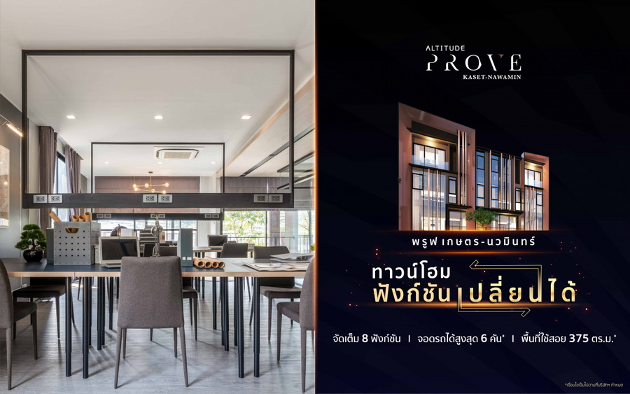 "อัลติจูด พรูฟ เกษตร-นวมินทร์" ทาวน์โฮมฟังก์ชัน เปลี่ยนได้ จัดเต็ม 8 ฟังก์ชัน จอดรถสูงสุดได้ 6 คัน* พื้นที่ใช้สอย 375 ตร.ม. หลังสุดท้าย แถมลิฟท์* 17.7 ล้านบาท