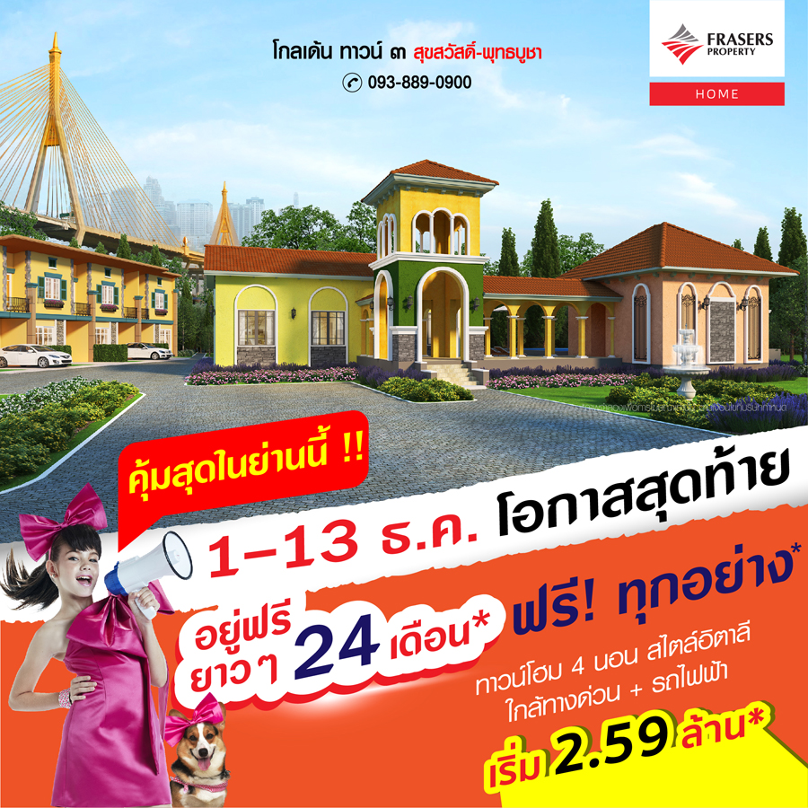 Promotion : 1-12 ธ.ค. นี้ ซื้อบ้านตอนนี้ ให้อยู่ฟรียาวๆ นาน 24 เดือน* ทาวน์โฮม 4 ห้องนอน โครงการใหม่ สไตล์อิตาลีพร้อมสโมสรหรู และสวนสวยรอบโครงการ สุดยอดทำเล ใกล้ทางด่วน + โรบินสัน เริ่ม 1.89 ล้าน*