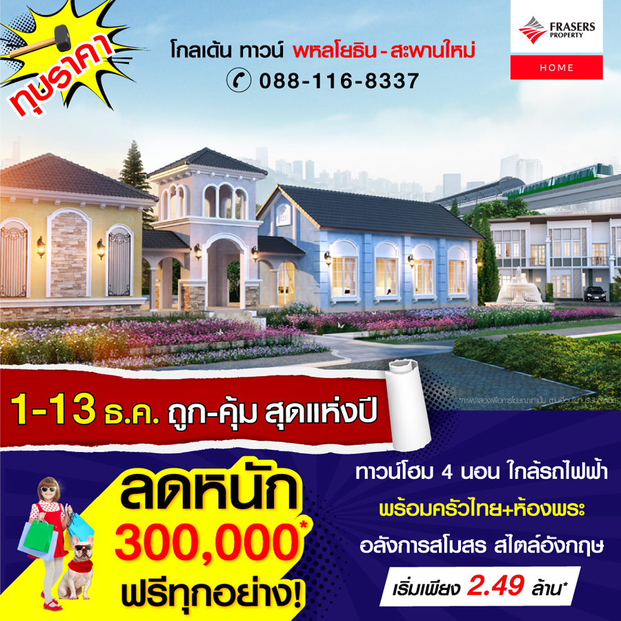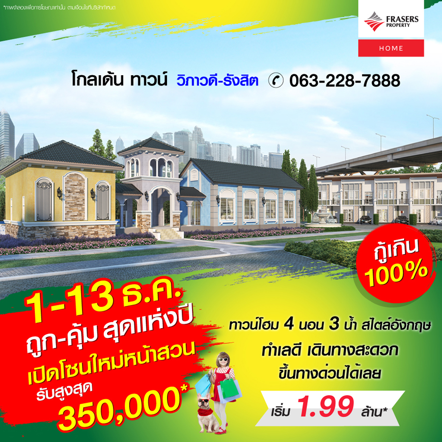 Promotion : 1-13 ธ.ค.นี้ ถูก-คุ้ม สุดแห่งปี รับคืนสูงสุด 3 แสน* เปิดโซนหน้าสวน พร้อมโปรแรง ผ่อนถูกกว่าเช่า ผ่อนเพียงล้านละ 3,300 บาท/เดือน* คุ้มยิ่งกว่าคุ้ม ราคาสุดพิเศษเพียง 1.89 ล้าน* ทาวน์โฮม 4 ห้องนอน ฟังก์ชันครบครัน พร้อมสโมสรหรู + สระว่ายน้ำ ทำเลคุณภาพ ติดถนนใหญ่+ห้างบิ๊กซี
