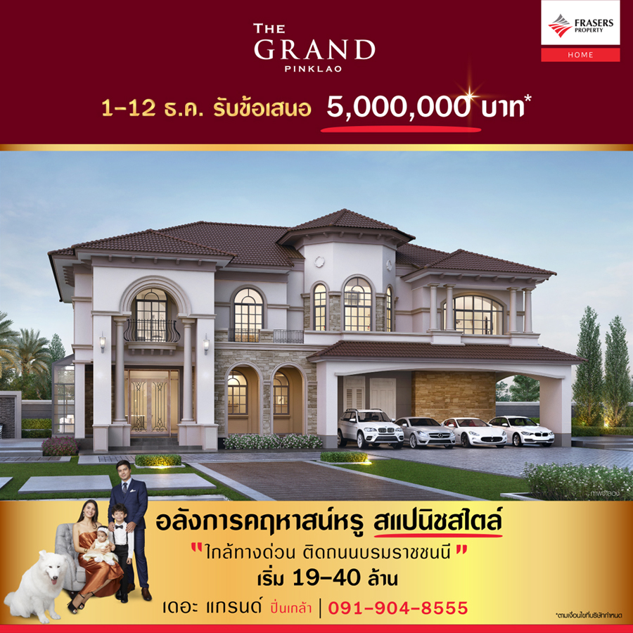 Promotion : เดอะแกรนด์ ปิ่นเกล้า คฤหาสน์หรู " Spanish Style " 1,000 ตร.ม. ที่ดินใหญ่กว่าครึ่งไร่ พร้อมมุมสวนส่วนตัว 360 องศา เริ่ม 19-40 ล้าน* พิเศษ 1-12 ธ.ค. นี้ รับส่วนลดสูงสุดกว่า 5,000,000 บาท* ในอาณาจักรสแปนิช ที่สุดแห่งความภูมิฐาน คลับเฮาส์หรูดีไซน์เท่ โดดเด่นเป็นเอกลักษณ์ใหม่ สง่างาม บนทำเลศักยภาพ ย่านปิ่นเกล้า