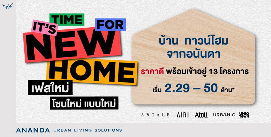 It's time for new home เฟสใหม่ โซนใหม่ แบบใหม่ บ้าน ทาวน์โฮม จากอนันดา ราคาดี พร้อมเข้าอยู่ 13 โครงการ เริ่ม 2.29 - 50 ล้านบาท*