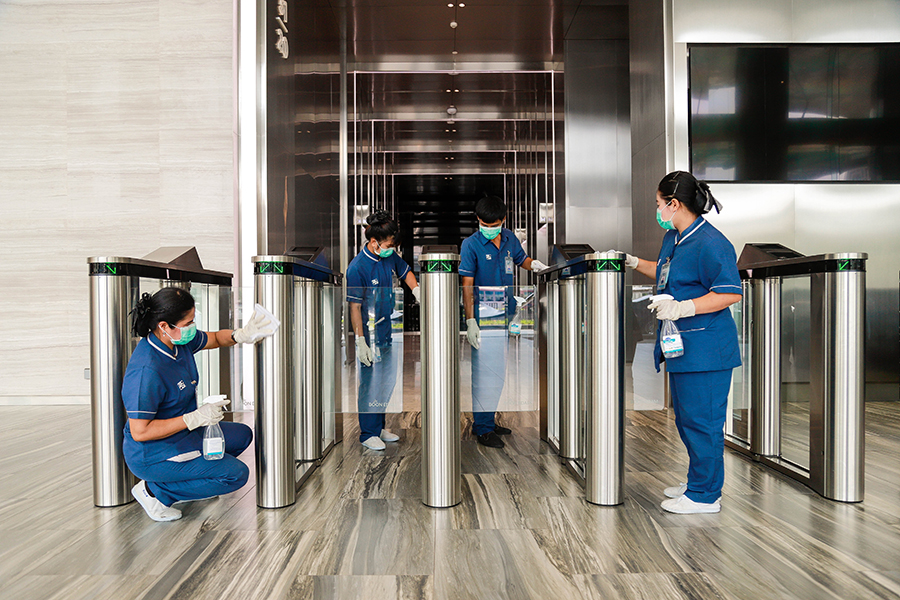 เพิ่มเจ้าหน้าที่เพื่ออำนวยความสะดวกในการจับหรือสัมผัสอุปกรณ์เข้า-ออกอาคาร ลดการสัมผัสพื้นผิวสาธารณะ และลดความหนาแน่นจากากรอคิว