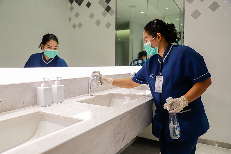 ใช้น้ำยาฆ่าเชื้อทำความสะอาดจุดสัมผัสอยู่เสมอ อาทิ ห้องน้ำ ราวจับ ลิฟต์ ปุ่มกดลิฟต์ทุกครึ่งชั่วโมง ทั้งนี้ทางอาคารมีการติดตั้งใช้ลิฟท์ ระบบ Destination control ซึ่งช่วยลดจำนวนครั้งการสัมผัส เรียกลิฟท์โดยไม่ต้องกดปุ่ม อีกทั้ง พ่นน้ำยาฆ่าเชื้อทำความสะอาดพื่นที่ส่วนกลางทุกสัปดาห์