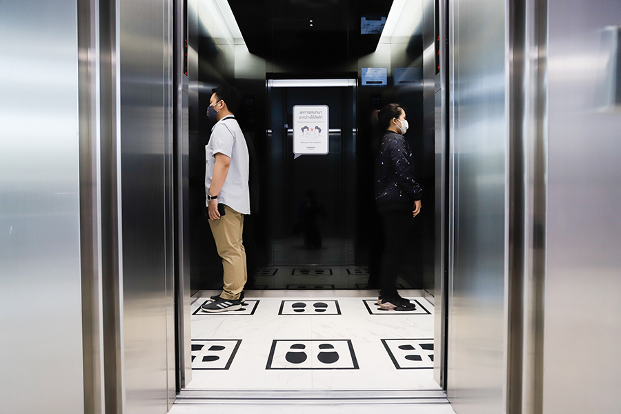 กำหนดระยะห่าง ในการผ่านทางเข้า-ออก อัตโนมัติ และระหว่างรอลิฟต์โดยสาร และกำหนดจำนวนผู้โดยสารลิฟต์ต่อเที่ยว เว้นระยะห่าง และงดสนทนาระหว่างโดยสาร