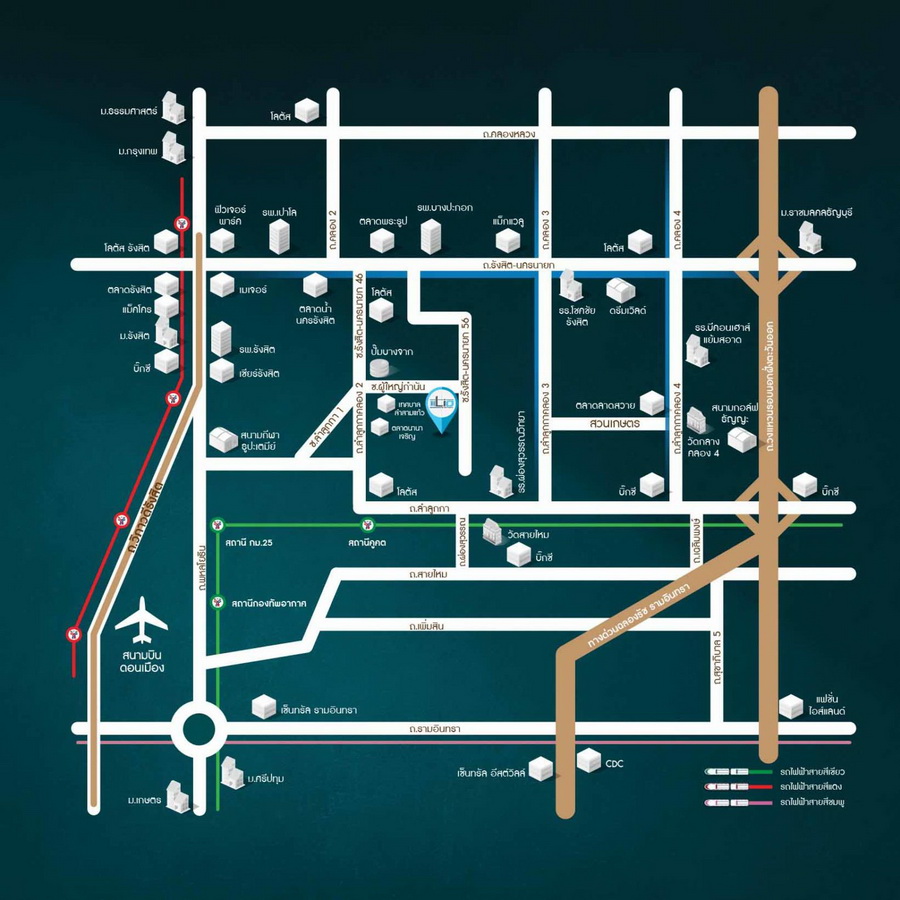 - รถไฟฟ้าสายสีเขียว (สถานีคูคต) และรถไฟฟ้าสายสีแดง (ในอนาคต)