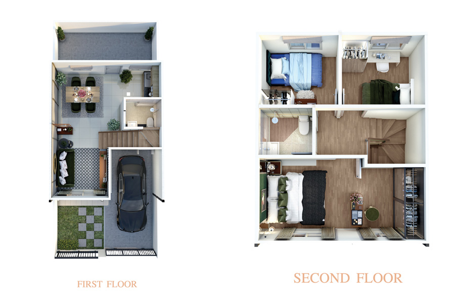 2. แบบบ้าน LILLE พื้นที่ใช้สอย 105 ตร.ม.** 3 ห้องนอน 2 ห้องน้ำ 1 ห้องรับแรก ส่วนเตรียมอาหาร ที่จอดรถ 1 คัน