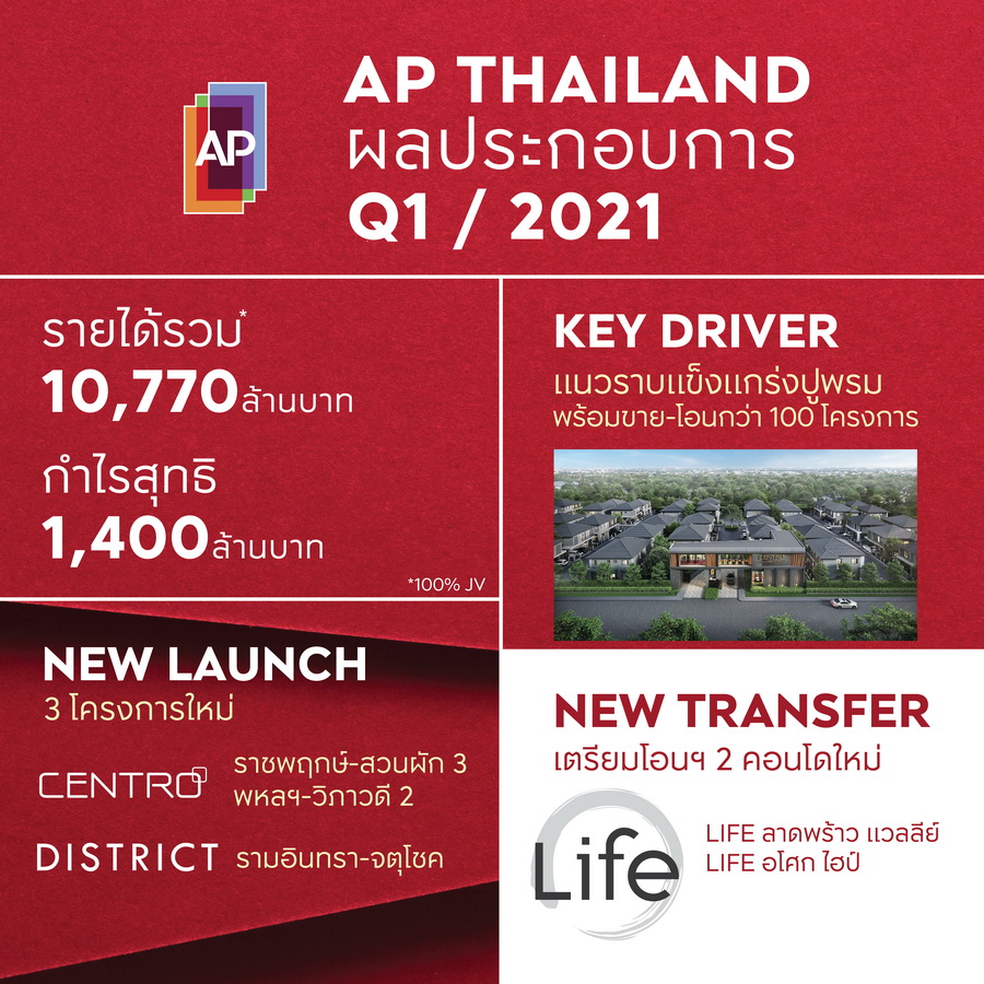 12 พ.ค. 64 142เอพี ไทยแลนด์ โชว์แนวราบแข็งแกร่ง ดันรายได้ไตรมาสแรกกว่า 10,770 ล้านบาท แบ็คล็อกรวม 33,700 ล้าน