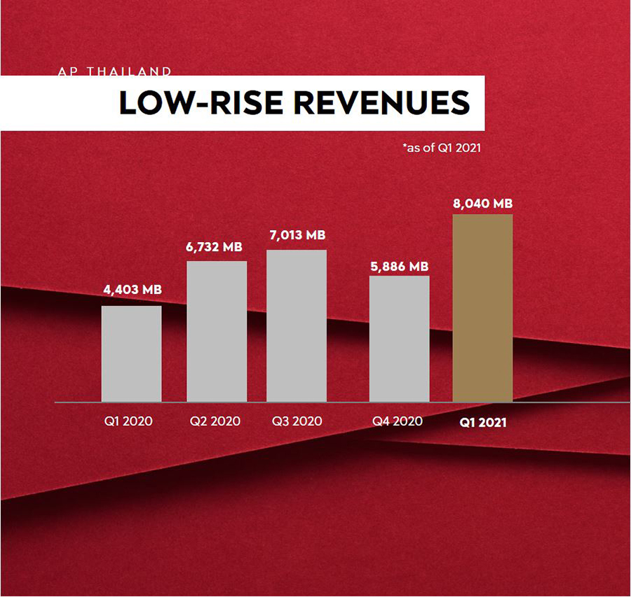 ทั้งนี้ วิกฤตการแพร่ระบาดยังคงสร้างความเสียหายให้กับเศรษฐกิจอย่างไม่สิ้นสุด หลายคนมองว่าปีที่ผ่านมาดำเนินธุรกิจด้วยความยากลำบากแล้ว แต่จากสถานการณ์ระบาดรอบใหม่นี้สะท้อนได้อย่างชัดเจนถึงความยากลำบากและความท้าทายที่รออยู่อีกมาก สำหรับทางรอดของธุรกิจพัฒนาอสังหาริมทรัพย์ นอกจากการบริหารจัดการความพร้อมภายในองค์กรรวมถึงงบกระแสเงินสดแล้ว การมีสินค้าพร้อมขายกระจายไปในหลายทำเล คืออีกหนึ่งกลยุทธ์สำคัญที่ผลักดันให้เอพีประสบความสำเร็จด้วยการขยายโอกาสที่มากขึ้น โดยเฉพาะสินค้ากลุ่มแนวราบที่ยังคงเป็นซูเปอร์สตาร์ โดยบริษัทฯ มีรายได้รวมจากสินค้าแนวราบที่เติบโตสูงขึ้นในทุกไตรมาส สะท้อนถึงความแข็งแกร่งที่เกิดขึ้นจากภายใน ในการพร้อมรับมือกับกฎกติกาโลกที่เปลี่ยนแปลงไป"