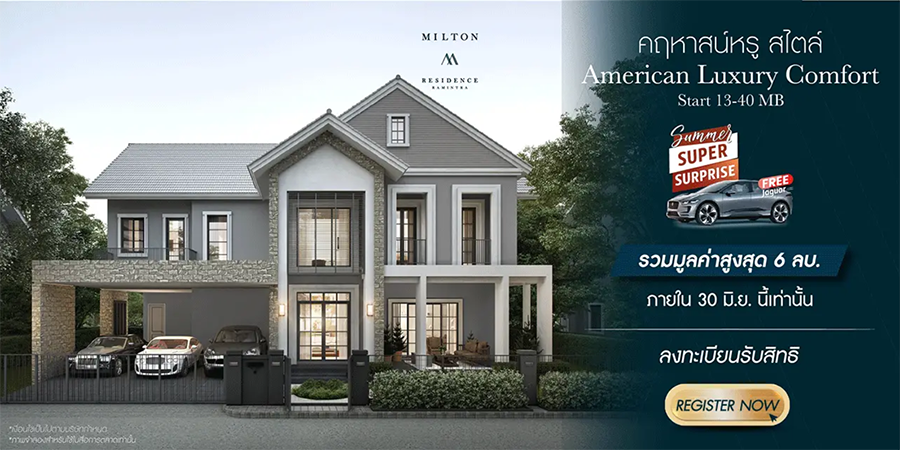 มิลตัน เรสซิเดนซ์ รามอินทรา คฤหาสน์หรูสไตล์ American Luxury Comfort เริ่มต้น 13 - 40 ล้านบาท กับโปรโมชั่น Summer Super Surprise ขยายสิทธิถึง 30 มิ.ย. นี้เท่านั้น!! ฟรี Jaquar I-PACE รวมมูลค่าสูงสุด 6,000,000 บาท