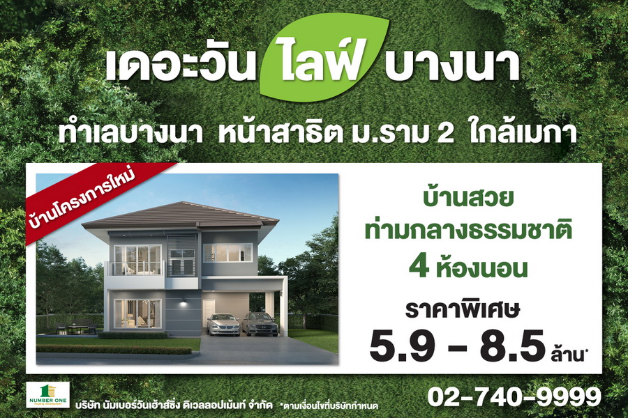 THE ONE life bangna บ้านโครงการใหม่ ทำเลบางนา ใกล้เมกา "ความสุขท่ามกลางธรรมชาติ" ที่ออกแบบอย่างลงตัว ตอบโจทย์ทุกไลฟ์สไตล์สำหรับทุกคนในครอบครัว หน้าโรงเรียนสาธิตมหาวิทยาลัยรามคำแหง 2 บางนา กม.8 พร้อมให้คุณเป็นเจ้าของแล้ววันนี้ ราคาพิเศษเริ่มต้นเพียง 5.9 ล้านบาทบริษัท นัมเบอร์วันเฮ้าส์ซิ่ง ดิเวลลอปเม้นท์ จำกัด เจ้าตลาดอสังหาริมทรัพย์คุณภาพย่านบางนา เปิดจองบ้านโครงการใหม่ THE ONE life bangna ความสุขท่ามกลางธรรมชาติ เริ่มต้นที่หน้าบ้านคุณด้วยความใส่ใจในการออกแบบบ้านทุกหลังให้สามารถรับลมและแสงธรรมชาติได้ตลอดวัน ที่ออกแบบอย่างลงตัวตอบโจทย์ทุกไลฟ์สไตล์สำหรับทุกคนในครอบครัวเปิดโซนคลับเฮ้าส์ด้านหน้าโครงการให้คุณได้ฟิตแอนด์เฟิร์มทุกวัน,อุ่นใจในระบบรักษาความปลอดภัยตลอด 24 ชั่วโมงตั้งแต่ทางเข้าโครงการจนถึงตัวบ้านด้วย Triple Security มี Double Gate ระบบ Security Gate เพิ่มความปลอดภัย 2 ชั้นตั้งแต่ทางเข้าโครงการ, กล้องวงจรปิดทั่วโครงการ ตัวบ้านมีระบบรักษาความปลอดภัยทั้ง Motion Sensors และ Magnetic Sensors ตรวจจับความเคลื่อนไหว ป้องกันการบุกรุกและการงัดแงะการเดินทางสะดวกสบายหลายเส้นทางเชื่อมต่อถนนเทพรัตน (บางนา-ตราด) ถนนกาญจนาภิเษก พระราม 9 อ่อนนุช สนามบินสุวรรณภูมิ ถนนเฉลิมพระเกียรติ ร.9 หน้าโรงเรียนสาธิตมหาวิทยาลัยรามคำแหง 2 บางนา กม.8THE ONE life bangna ท่วงทำนองของความสุขท่ามกลางธรรมชาติ พร้อมให้คุณเป็นเจ้าของกับ 2 แบบบ้าน 2 สไตล์ เลือกได้ตามใจคุณ แบบบ้าน Vanda พื้นที่ใช้สอย 161 ตร.ม. บนที่ดิน 50.60 ตร.ว. ขนาด 4 ห้องนอน 3 ห้องน้ำ 1 ห้องครัว 2 ที่จอดรถ ราคาพิเศษเพียง 7.83 ล้านบาท (จากราคาปกติ 8.83 ล้านบาท) แบบบ้าน Ivy พื้นที่ใช้สอย 141 ตร.ม. บนที่ดิน 36.80 ตร.ว. ขนาด 4 ห้องนอน 3 ห้องน้ำ 2 ที่จอดรถ ราคาพิเศษเพียง 5.9 ล้านบาท (จากราคาปกติ 6.82 ล้านบาท)สอบถามรายละเอียดเพิ่มเติมได้ที่ 02-740-9999