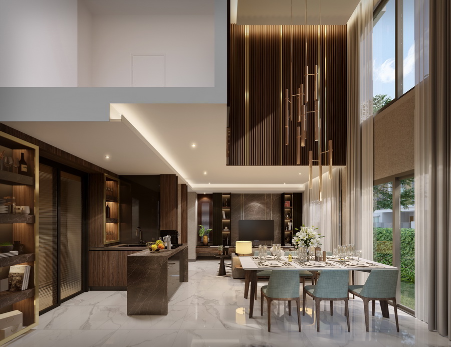 บ้านแฝด 3 ชั้น แบบบ้าน TWIN PRIDE บ้านหลังใหญ่ ที่มาพร้อมกับพื้นที่แห่งชีวิตที่เรียบหรู กับความพิถีพิถันในการดีไซน์ที่เน้นการ Connect ทุก Lifestyle ของสมาชิกทุกคนในครอบครัว เอาไว้ด้วยกันในพื้นที่ที่เปิดกว้างยิ่งขึ้น โดยเฉพาะในบริเวณ Living & Dining Hall แบบ Double Volume Space ที่สูงถึง 5.9 เมตร พร้อมกระจกบานสูงจากพื้นจรดเพดานให้ความรู้สึกหรูหรา โปร่งสบาย พร้อมเปิดมุมมองรับทัศนียภาพ ของธรรมชาติได้อย่างเต็มที่ เติมความอบอุ่นให้สมาชิกครอบครัวทุก Generation ทำให้ทุกคนสัมผัสได้ถึงความใกล้ชิดกันมากกว่าที่เคย ขนาดที่ดินมาตรฐานเริ่มต้น 37 ตร.วา พื้นที่ใช้สอยประมาณ 290 ตร.ม. ประกอบด้วย 4 ห้องนอน 4 ห้องน้ำ 1 ห้องครัว 1 ห้องอเนกประสงค์ และ 3 ที่จอดรถ พร้อมฟังก์ชันพิเศษ ห้องนอนสำหรับผู้สูงอายุบริเวณชั้นล่าง