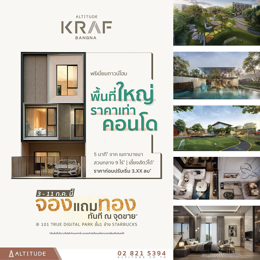 "อัลติจูด คราฟ บางนา (Altitude Kraft Bangna)" 3 - 11 กรกฎาคม 2564 นี้ จองแถมทองทันที*!! ราคาสุดท้ายก่อนปรับขึ้น 3.xx ล้านบาท* พร้อม ON-TOP อีกมากมาย พิเศษเฉพาะที่บูธเท่านั้น : 101 TRUE DIGITAL PARK ชั้น 1 ข้าง STARBUCKS (BTS ปุณณวิถี) พื้นที่ใหญ่กว่า ส่วนกลางมากกว่า ปรับฟังก์ชั่นได้มากกว่า ราคาเท่าคอนโด