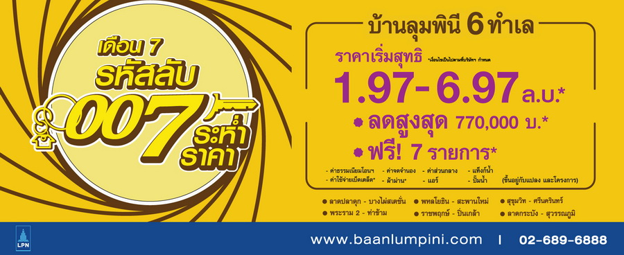 เดือน 7 รหัสลับ 007 ระห่ำราคา ลดสูงสุด 770,000 บาท* ฟรี! 7 รายการ* / ค่าธรรมเนียมโอนฯ / ค่าจดจำนอง ค่าส่วนกลาง 2 ปี* / แท็งก์น้ำ / ปั๊มน้ำ / แอร์ / ผ้าม่าน* 6 โครงการพร้อมอยู่ จากบ้านลุมพินี