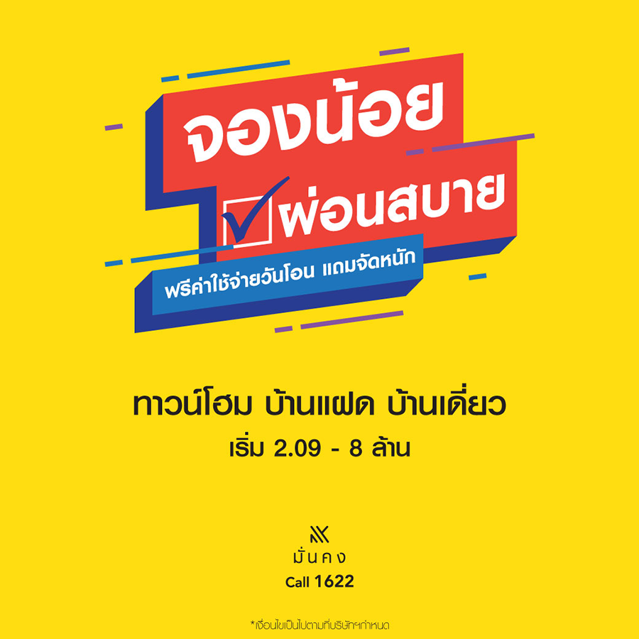 บริษัท มั่นคงเคหะการ จำกัด (มหาชน) หรือ MK บริษัทผู้พัฒนาอสังหาริมทรัพย์ เพื่อการขาย เพื่อเช่าและ เพื่อการบริการ รวบตึงทั้ง บ้านเดี่ยว บ้านแฝด ทาวน์โฮม ราคาเริ่มต้น 2.09 - 8 ล้านบาท มาให้เลือกกับโปรโมชั่น สุดพรีเมี่ยม "จองน้อย ผ่อนสบาย" พิเศษ!! สำหรับทาวน์โฮมจองเพียง 999 บาท สำหรับบ้านแฝด บ้านเดี่ยว จอง 9,999 พร้อมผ่อนสบาย ล้านละ 1,000 บาท นาน 1 ปี* จัดหนัก จัดเต็มด้วยส่วนลด สูงสุดถึง 7 แสนบาท และของแถมแบบไม่อั้น ฟรี! เครื่องใช้ไฟฟ้า เครื่องปรับอากาศ และฟรีค่าใช้จ่ายวันโอน* ตั้งแต่วันนี้ - 31 สิงหาคม 2564 นี้ เท่านั้น!