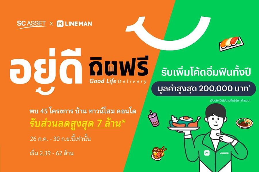 บริษัท เอสซี แอสเสท คอร์ปอเรชั่น จำกัด (มหาชน) หรือ SC ผู้นำ Living Solutions Provider โดยนายณัฏฐกิตติ์ ศิริรัตน์ หัวหน้าสายงานการตลาด กล่าวว่า "จากการปรับเปลี่ยนพฤติกรรมของผู้บริโภคในปัจจุบัน พบว่า ด้วยความสะดวกสบายในการใช้บริการสั่งอาหารผ่าน Application เดลิเวอรี่ เป็นอีกหนึ่งความจำเป็นสำหรับการใช้ชีวิตระหว่างช่วงที่ทุกคนต้องใช้ชีวิตอยู่ที่บ้านมากขึ้นเพื่อความปลอดภัย เป็นเหตุผลให้ SC x LINE MAN ผู้นำแพลตฟอรม์ออนดีมานด์ของไทย Application หนึ่งในใจลูกค้าเลือกใช้บริการมากที่สุด พร้อมด้วยการมีฐานแหล่งข้อมูลที่ตอบโจทย์ด้านการตลาดและเข้าถึงกลุ่มผู้บริโภคที่หลากหลายโดยที่ร่วมกับนายวุฒิชัย น้ำใจประเสริฐ ผู้อำนวยการฝ่ายพัฒนาธุรกิจ LINE MAN Wongnai ปล่อยแคมเปญพิเศษภายใต้คุณภาพชีวิตดีๆ "อยู่ดี กินฟรี" (Good Life Delivery) สำหรับลูกค้าที่จองซื้อบ้าน 45 โครงการคุณภาพ บ้าน ทาวน์โฮม และ คอนโด ราคาเริ่ม 2.39-62 ล้านบาทตั้งแต่วันนี้ - 30 กันยายน 2564"