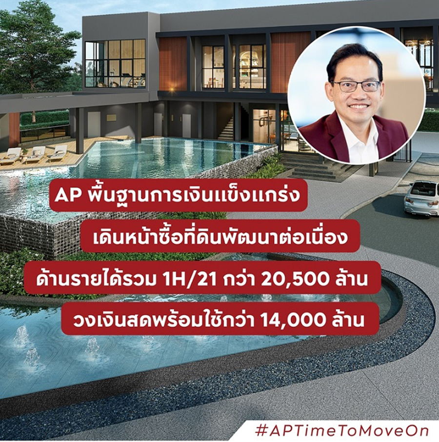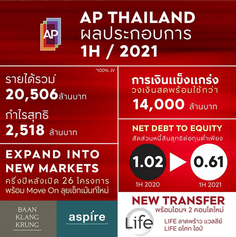 นายวิทการ จันทวิมล รองกรรมการผู้อำนวยการ สายงานกลยุทธ์องค์กรและการสร้างสรรค์ บมจ. เอพี ไทยแลนด์ กล่าวว่า "ถึงแม้ภาพรวมเศรษฐกิจจะผันผวนจากสถานการณ์การแพร่ระบาดที่เกิดขึ้น แต่บริษัทฯ ก็ยังคงดำเนินธุรกิจและสร้างผลงานได้เกินเป้าหมายที่คาดไว้ โดยผลการดำเนินงานครึ่งปีแรกของปี 2564 ด้านรายได้รวมจากสินค้าแนวราบ กลุ่มคอนโดมิเนียม (100% JV) และธุรกิจอื่นๆ นับเป็นนิวเรคคอร์ดครั้งใหม่ โดยบริษัทฯ สามารถทำรายได้รวมที่สูงถึง 20,506 ล้านบาท เพิ่มขึ้นอย่างต่อเนื่องหากเทียบกับช่วงเวลาเดียวกันของปีที่ผ่านๆ มา ด้านกำไรสุทธิมากกว่า 2,518 ล้านบาท เพิ่มขึ้น 37% จากงวดเดียวกันของปีก่อนหน้าที่มีกำไรสุทธิรวมเท่ากับ 1,832 ล้านบาท ด้านสัดส่วนหนี้สินสุทธิต่อทุนอยู่ในระดับต่ำมากเพียง 0.61 เท่า ซึ่งทั้งหมดล้วนสะท้อนถึงความสามารถในการบริหารจัดการภายในองค์กร ควบคู่ไปกับการบริหารพอร์ตสินค้า และการบริหารกระแสเงินสดที่รัดกุมและมีประสิทธิภาพท่ามกลางสภาวะวิกฤตที่เกิดขึ้น