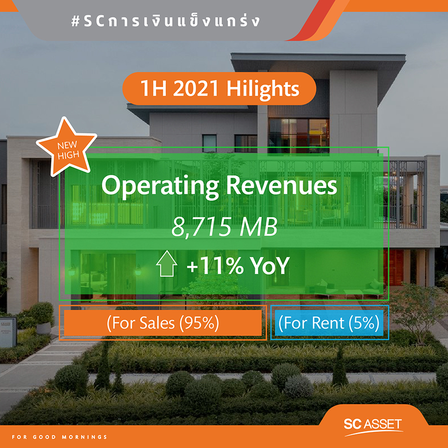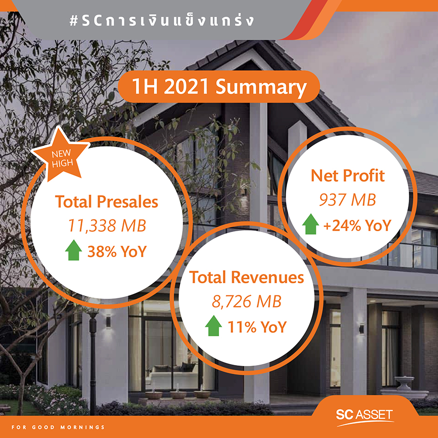 นายณัฐพงศ์ คุณากรวงศ์ ประธานเจ้าหน้าที่บริหาร บริษัท เอสซี แอสเสท คอร์ปอเรชั่น จำกัด (มหาชน) หรือ SC เปิดเผยว่า "จากความสำเร็จของช่วงครึ่งปีแรกที่ผ่านมา ซึ่งได้ทำนิวไฮทั้งยอดขายรวมและยอดขายแนวราบจากบ้านเดี่ยวทุกราคาขายดี จึงส่งผลให้ผลการดำเนินงานเติบโตดีเยี่ยมทั้งรายได้และกำไรสุทธิ โดยสรุปดังนี้คือ ครึ่งปีแรก บริษัทมีรายได้รวม 8,726 ล้านบาท เติบโต 11% โดยที่รายได้จากการดำเนินงานทำนิวไฮ 8,715 ล้านบาท แบ่งเป็น 95% จากรายได้จากการขาย และ 5% จากรายได้ค่าเช่า โดยในส่วนรายได้จากการขาย มาจากรายได้แนวราบทำนิวไฮ 6,825 ล้านบาท เติบโต 23% กำไรสุทธิ 937 ล้านบาท เติบโต 24% ขณะที่ยอดขายรวมทำนิวไฮ 11,338 ล้านบาท เติบโต 38% แบ่งเป็นยอดขายแนวราบ 83% และยอดขายแนวสูง 17%"