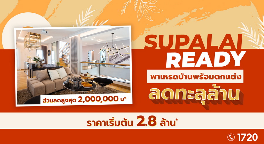SUPALAI READY พาเหรดบ้านพร้อมตกแต่ง ลดทะลุล้านมาพร้อมส่วนลดสูงสุด 2,000,000 บาท* เริ่มเพียง 2.8 ล้านบาท* ให้คุณได้เป็นเจ้าของ บ้านพร้อมตกแต่ง สวยมีระดับ โดยผู้เชี่ยวชาญด้านการออกแบบและตกแต่งภายใน สะดวก ง่าย ประหยัดเวลา ไม่เสียเวลาหาซื้อเฟอร์นิเจอร์ ยื่นกู้สินเชื่อเพื่อนำเงินมาตกแต่งบ้าน เพราะเรามีให้ พร้อมใช้อยู่อาศัยได้ทันที
