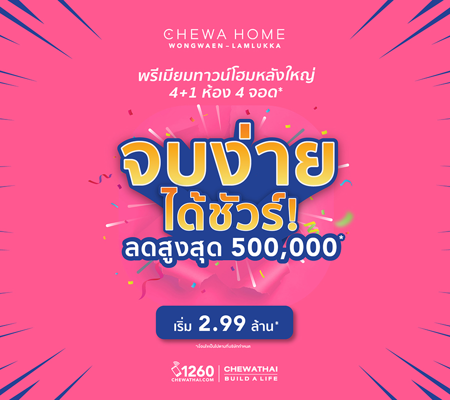 ชีวาโฮม รังสิต - ปทุม เปิดโซนใหม่ แบบบ้าน ขายดี จบง่าย ได้ชัวร์ ลดสูงสุด 500,000 บาท* เริ่ม 2.4 - 3.5 ล้านบาท*