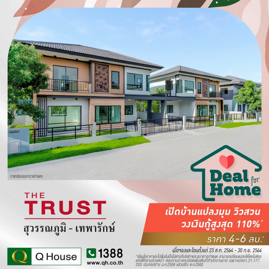 บริษัท ควอลิตี้เฮ้าส์ จำกัด (มหาชน) ผู้พัฒนาอสังหาริมทรัพย์ชั้นนำ เปิดเผยว่า ล่าสุดได้เปิดตัว แคมเปญ "Deal For Home" มอบข้อเสนอพิเศษให้ลูกค้าหลากหลายรายการ อาทิ รับส่วนลดมูลค่าตั้งแต่ 100,000 บาท - 2,000,000 บาท/ ผ่อนต่ำเริ่มล้านละ 1,000 บาทต่อเดือน นาน 1 ปี/ บ้านพร้อมตกแต่งราคาพิเศษ/ ฟรีเครื่องปรับอากาศ/ ฟรีค่าโอนกรรมสิทธิ์/ ฟรีค่าส่วนกลางสูงสุด 2 ปี/ ฟรีชุดครัว/ ฯลฯ กับ 47 โครงการ ของบริษัทฯและบริษัทในเครือ หลากหลายรูปแบบบ้านเพื่อตอบโจทย์ไลฟ์สไตล์ที่แตกต่างของผู้อยู่อาศัย ทั้งบ้านเดี่ยว บ้านแฝด และทาวน์โฮม ภายใต้แบรนด์ ควอลิตี้เฮ้าส์ คาซ่า เดอะทรัสต์ และกัสโต้ ในเขตกรุงเทพฯ ปริมณฑล และ 4 หัวเมืองหลักต่างจังหวัด คือ เชียงใหม่ ชลบุรี ระยอง และฉะเชิงเทรา ราคา 1.99 - 22 ล้านบาท* เมื่อจองและโอนตั้งแต่วันที่ 23 สิงหาคม 2564 - 30 กันยายน 2564 เท่านั้น
