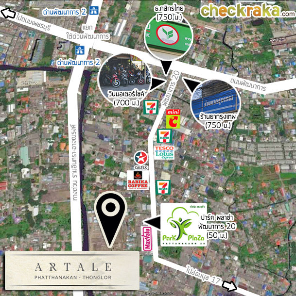 อาเทลล์ พัฒนาการ - ทองหล่อ (Artale Pattanakarn - Thonglor) ตัวโครงการตั้งอยู่ภายในซอยพัฒนาการ 20 สามารถทะลุเชื่อมไปซอยอ่อนนุช 17 ได้ ซอยนี้เรื่องความอุดมสมบูรณ์ของอาหารการกินมีตัวเลือกเลยทีเดียว มีร้านค้า, ร้านสะดวกซื้อ และ Community Mall กระจายอยู่โดยรอบ ถือว่าตอบโจทย์คนที่กำลังมองหาบ้านชานเมือง แต่ก็ยังไม่ได้ออกนอกเมืองจนเกินไป สะดวกเรื่องการเดินทาง ใกล้ทางด่วนและระบบขนส่งสาธารณะ มีทางลัดที่สามารถลัดเลาะเข้า-ออกเมืองได้สะดวก อีกทั้งตัวทำเล