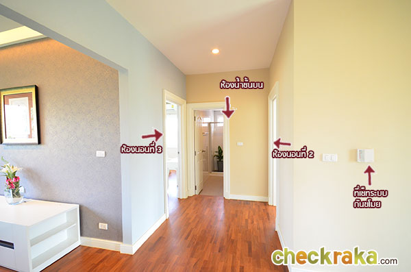 ออกมาที่โถงทางเดินฝั่งขวามือของตัวบ้านซึ่งเป็นตำแหน่งของห้องนอนเล็ก 2 ห้อง และห้องน้ำที่ชั้น 2 ของบ้าน Type นี้กันค่ะ (ฝั่งขวาที่คล้ายรีโมทคือกล่องสำหรับเซ็ทสัญญาณกันขโมยของบ้านค่ะ)