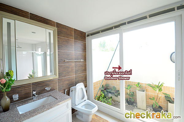 เปิดประตูเข้ามาดูห้องน้ำส่วนตัวของห้องนอนหลักกันบ้าง ฝั่งนี้ตกแต่งคล้ายๆกับห้องน้ำข้างล่าง เด็ดตรงความกว้างและลูกเล่นที่สามารถเปิดออกไปด้านนอกระเบียงที่ทำเป็น Outdoor Shower ค่ะ