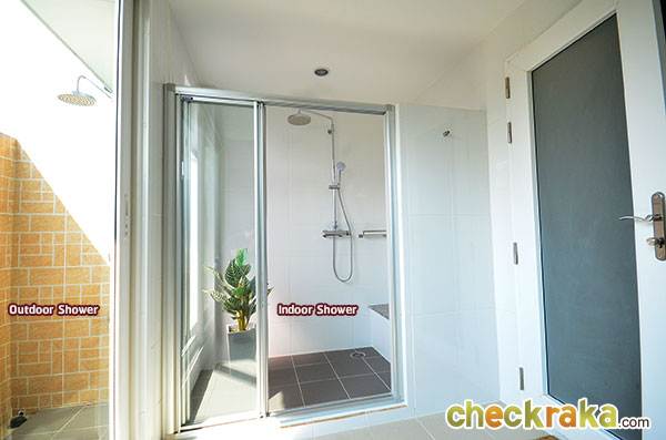 เปิดระเบียงถ่ายโซนอาบน้ำคู่ให้เห็นทั้ง Indoor และ Outdoor ค่ะ มี Rain Shower ให้ทั้งคู่เลย