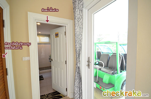 ภายในห้องน้ำชั้นล่างตกแต่งคล้ายๆ กันกับห้องน้ำอื่นๆ ในบ้าน แต่ห้องนี้จะไม่มีฉากกั้นอาบน้ำมาให้ค่ะ
