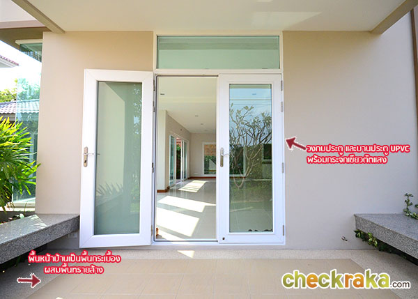 ทั้งตัวกรอบประตูและบานประตูเป็น UPVC เปิดรับวิวสวนสีเขียวที่ทางโครงการจัดมาให้รอบบ้าน
