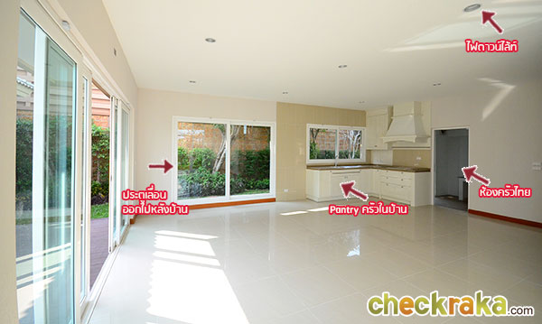 ส่วนบ้านเปล่าห้องทานอาหารไม่ได้ดรอปฝ้าค่ะ ไฟที่ทางโครงการจัดมาให้จะเป็นไฟแบบดาวน์ไลท์ค่ะ ส่วนนี้จะเห็นว่าบ้าน TYPE นี้เค้าจัดฟังก์ชั่นมาให้ทั้ง Panty ครัวนอก และห้องครัวไทยแยกออกมาเป็นสัดส่วนเลยค่ะ
