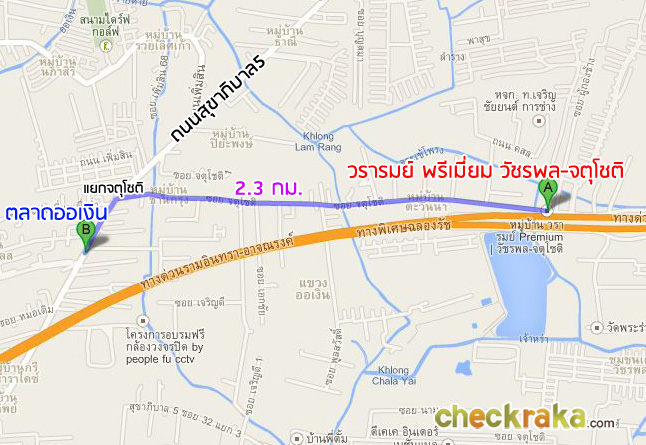 บรรยากาศรอบๆ โครงการค่อนข้างโล่งยังไม่ค่อยมีโครงการจัดสรร หรือสิ่งปลูกสร้างมากนัก ใครที่ชอบอากาศบริสุทธิ์อาจจะชอบแถวนี้ แต่หากต้องการความคึกคักก็แค่ขับรถเลี้ยวขวาออกจากโครงการไปที่ถนนสุขาภิบาล 5 ซึ่งอยู่ใกล้แค่ 2 กม. หรือจะชิวๆ สบายๆ ขึ้นทางด่วนไปลงถนนรามอินทรา หรือเกษตร-นวมินทร์ก็ทำได้ แต่ก่อนนี้ ถนนจตุโชติเคยเป็นถนน 2 เลน แต่พอขยายถนนเป็น 4 เลน ก็ทำให้รถวิ่งไปมาสะดวกขึ้น ย่านที่คึกคักหน่อยบนถนนจตุโชติก็จะเป็นโซนอาคารพาณิชย์ตามที่วงไว้ในกรอบของรูปข้างล่างนี้ค่ะ จะอยู่ช่วงกลางๆ ของถนนจตุโชติ ออกจากโครงการมาทางขวามือประมาณ 550 เมตร ก็จะถึงโซนนี้ค่ะ มีร้านสะดวกซื้อ, ร้านอาหารริมทาง, ร้านกาแฟ, อู่ซ่อมรถ ฯลฯ เป็นแหล่งที่พึ่งพาได้หากไม่อยากไปไหนไกล แต่ถ้าจะซื้อของเป็นเรื่องไปราว ก็สามารถไปที่เส้นสุขาภิบาล 5 ได้ซึ่งในเส้นนั้นจะมี ตลาดออเงิน และ Big C Market ซึ่งมี Community Mall อยู่
