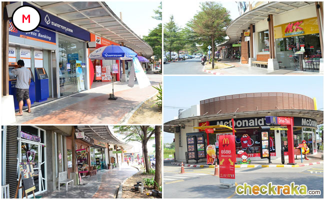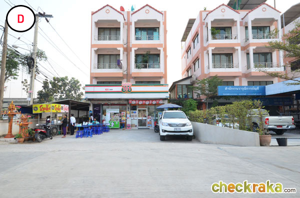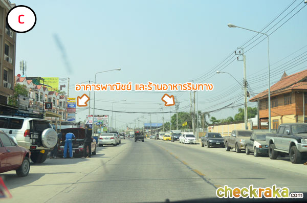 มองมาทางซ้ายมือจะมีร้านสะดวกซื้อ, ร้านอาหารริมทาง และสำนักงาน