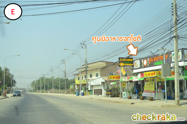 ทางด้านขวาของถนนมีศูนย์อาหารจตุโชติ และร้านอาหารริมทาง