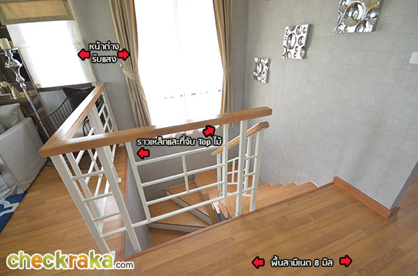 ส่วนหน้าพื้นบันไดเป็นไม้ยางพาราประสานทำสี ที่จับเป็นราวเหล็กติดท็อปไม้