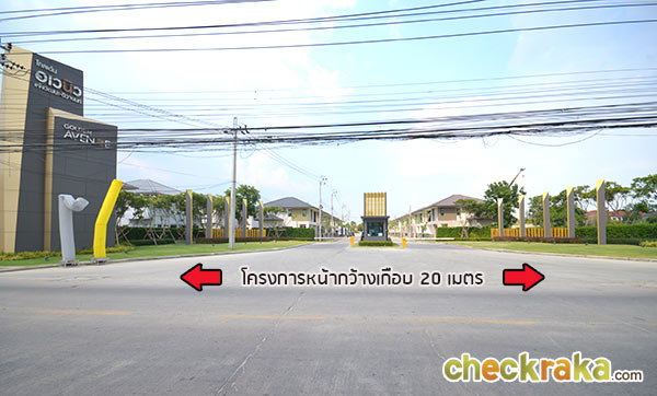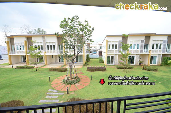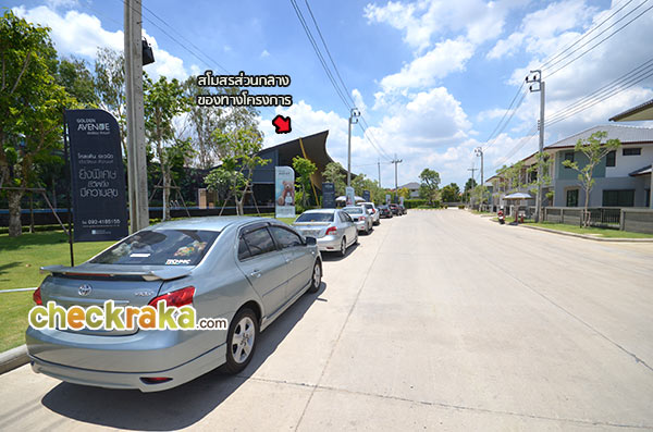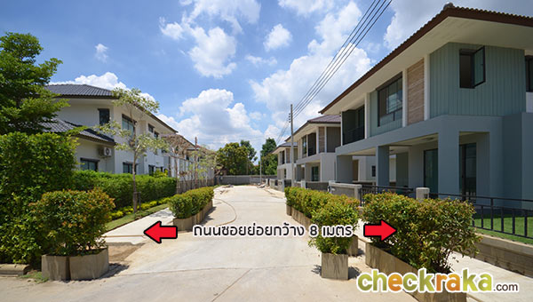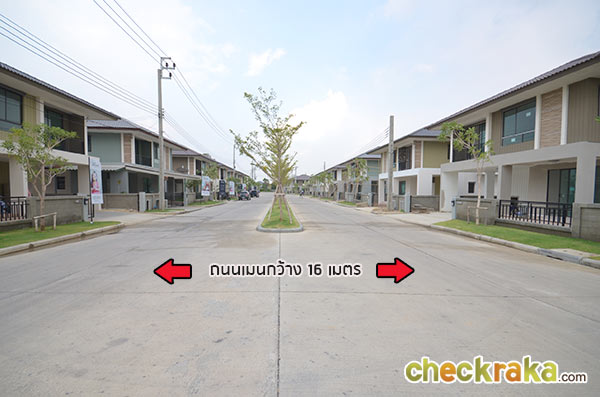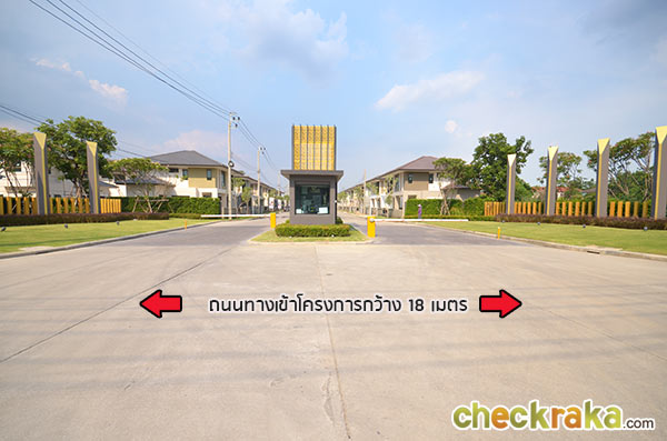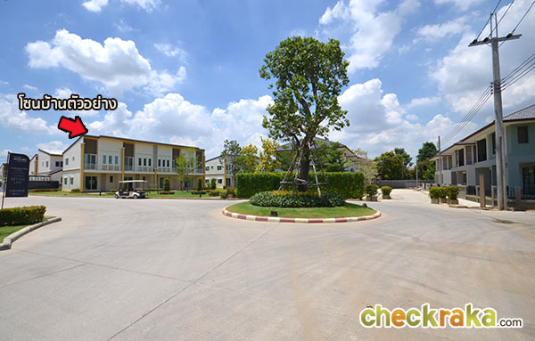วงเวียนที่ตั้งอยู่ก่อนช่วงกลางของแปลงที่ดิน ตัวอย่างภาพแสดงขนาดถนนซอยย่อยในโครงการ ที่ดินช่วงกลางที่กำลังทำการก่อสร้างถูกกั้นไว้เป็นสัดส่วน แบบบ้านภายในโครงการ