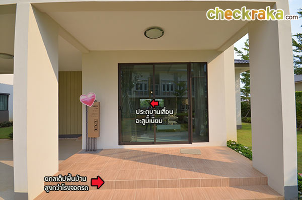 พื้นที่ด้านหน้าส่วนโรงรถ ทางเข้าตัวบ้านยกพื้นสูงเป็นสเต็ปบันได กันฝุ่นและกันน้ำเวลาทำความสะอาดโรงรถ