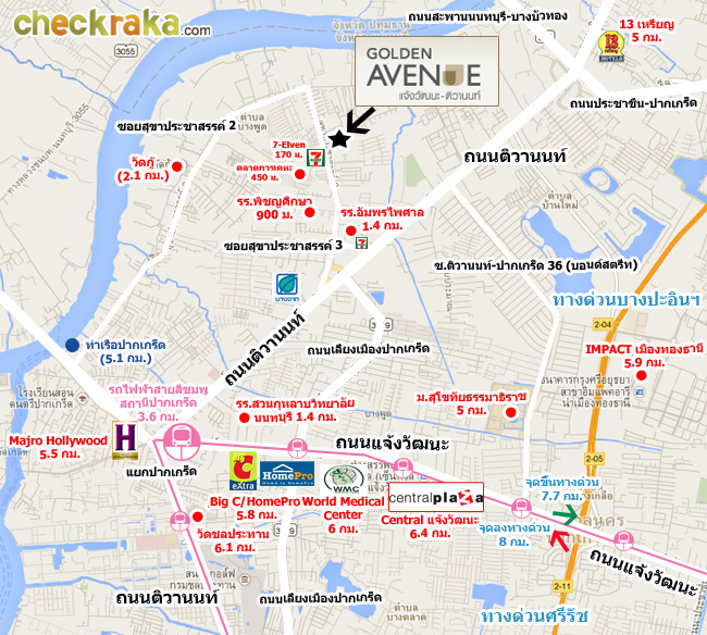 รูปแผนที่โครงการแจกแจงให้เห็นระยะใกล้-ไกลของโครงการกับสถานที่ หรือ Landmark รอบๆโครงการ เซ็นทรัล แจ้งวัฒนะ แหล่ง Shopping สำคัญของคนแถวนี้ (ห่างจากโครงการประมาณ 6.4 กม.)