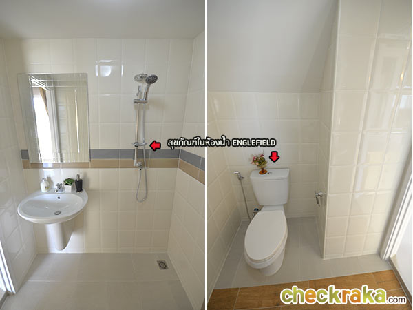 ห้องน้ำข้างบนจะตกแต่งด้วยสีที่เรียบกว่าห้องน้ำชั้นล่าง
