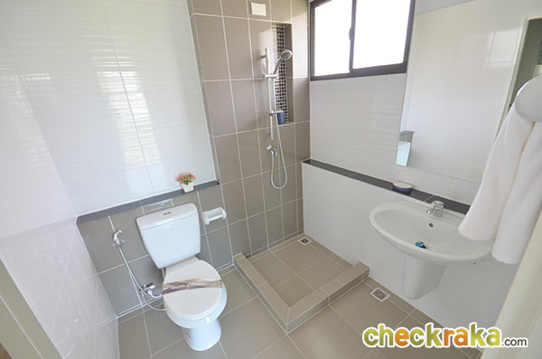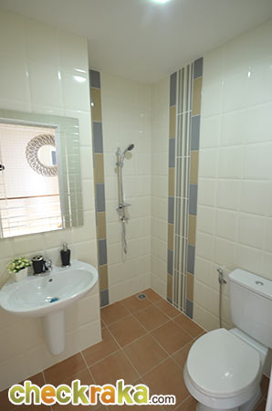 ส่วนพื้นที่เปียกก็ก่อธรณีไว้ให้เรียบร้อยเพียงติดม่าน หรือลงตู้อาบน้ำก็ใช้งานจริงได้น้ำไม่กระเด็นเลอะเทอะค่ะ