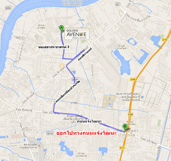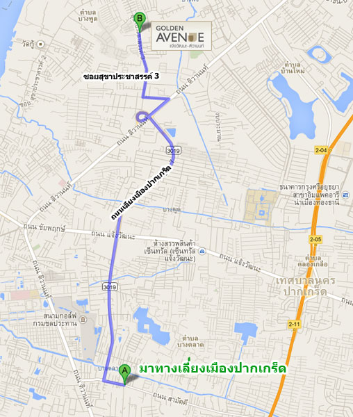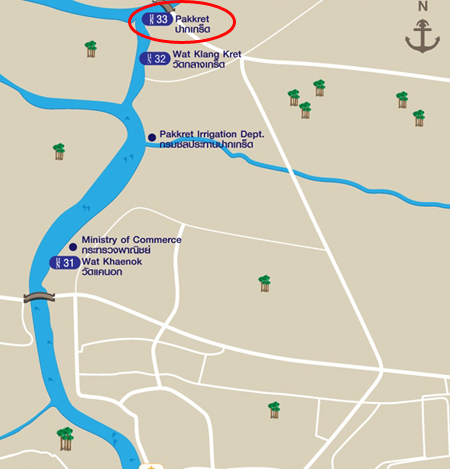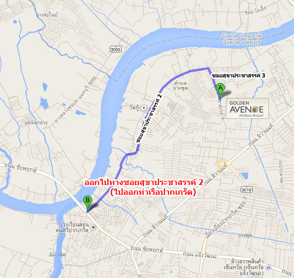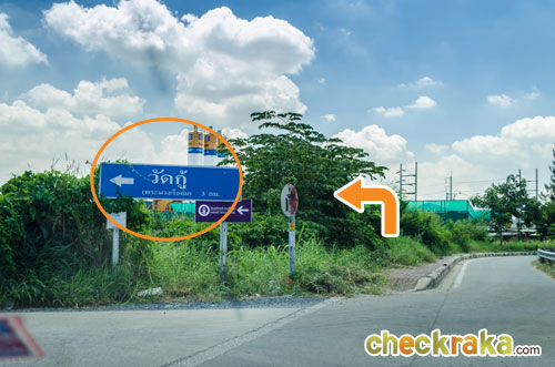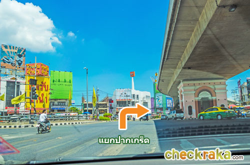 ตรงจากแยกปากเกร็ดไปอีกประมาณ 2.2 กิโลเมตร ให้ออกทางเบี่ยงซ้าย (ยึดป้ายวัดกู้)