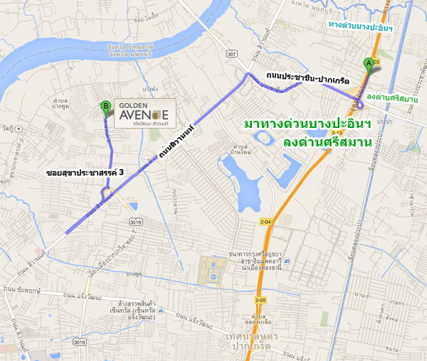 เส้นทางเข้าโครงการที่ 3 มาทางด่วนบางปะอินฯลงด่านศรีสมาน