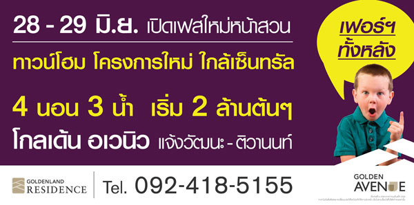 นอกจากนี้ทางทีมงาน CheckRaKa.com ยังได้รับข่าวฝากจากทางโกลเด้น แลนด์ เจ้าของโครงการว่าในเร็วๆ นี้ทางโครงการจะมีการจัดโปรโมชั่นพิเศษสำหรับผู้ที่สนใจซื้อบ้านในโครงการ "โกลเด้น อเวนิว แจ้งวัฒนะ-ติวานนท์" โดยลูกค้าจะได้รับข้อเสนอโปรโมชั่นราคาพิเศษ พร้อมโปรโมชั่นฟรีเฟอร์นิเจอร์ครบทั้งหลัง โดยทางโครงการมีกำหนดระยะเวลาในการจัดงานดังนี้ วันที่ 28-29 มิ.ย. 57 นี้ จัดงานเปิดเฟสใหม่หน้าสวนสำหรับบ้านแบบทาวน์โฮม ราคาเริ่ม 2 ล้านต้นๆ ที่มาพร้อมโปรโมชั่นพิเศษ ฟรีเฟอร์นิเจอร์ทั้งหลัง วันที่ 19-20 ก.ค. 57 นี้ จัดงานเปิดเฟสใหม่หน้าโครงการสำหรับบ้านเดี่ยว ราคาเริ่ม 3.99 ล้านบาท พร้อมโปรพิเศษ ฟรีเฟอร์นิเจอร์ทั้งหลัง สนใจสอบถามข้อมูลเพิ่มเติม โทร. 092-418-5155